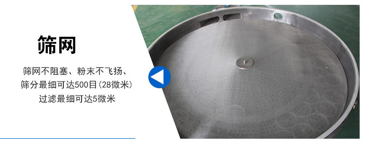 3.篩網(wǎng)不阻塞、粉末不飛揚、篩分可達(dá)500目(28微米)過濾可達(dá)5微米。
